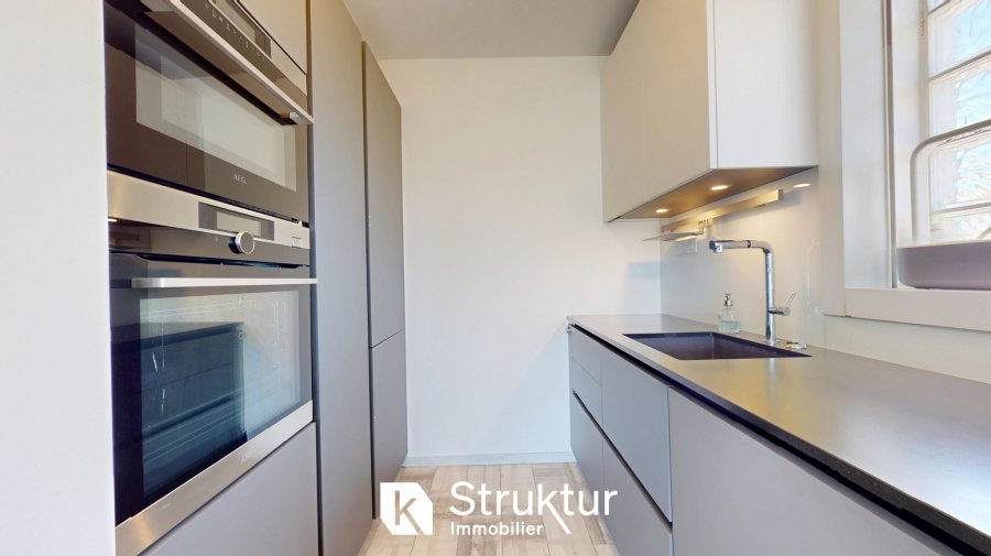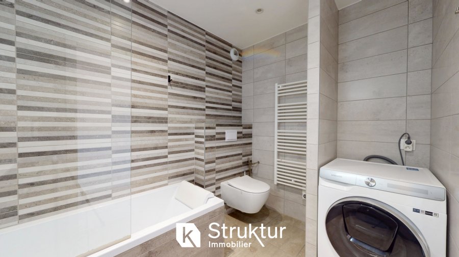 Deux chambres, dont une grande de 16 m2, garantissent un confort optimal. La salle de bains, moderne et soignée, dispose d'une baignoire avec paroi de douche, d'un meuble vasque avec miroir, d'un WC suspendu et d'un radiateur sèche-serviettes.