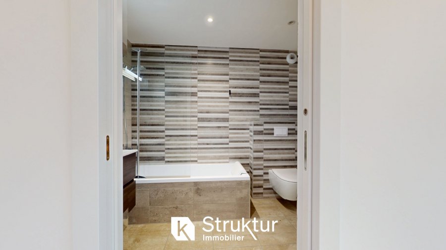 Deux chambres, dont une grande de 16 m2, garantissent un confort optimal. La salle de bains, moderne et soignée, dispose d'une baignoire avec paroi de douche, d'un meuble vasque avec miroir, d'un WC suspendu et d'un radiateur sèche-serviettes.
